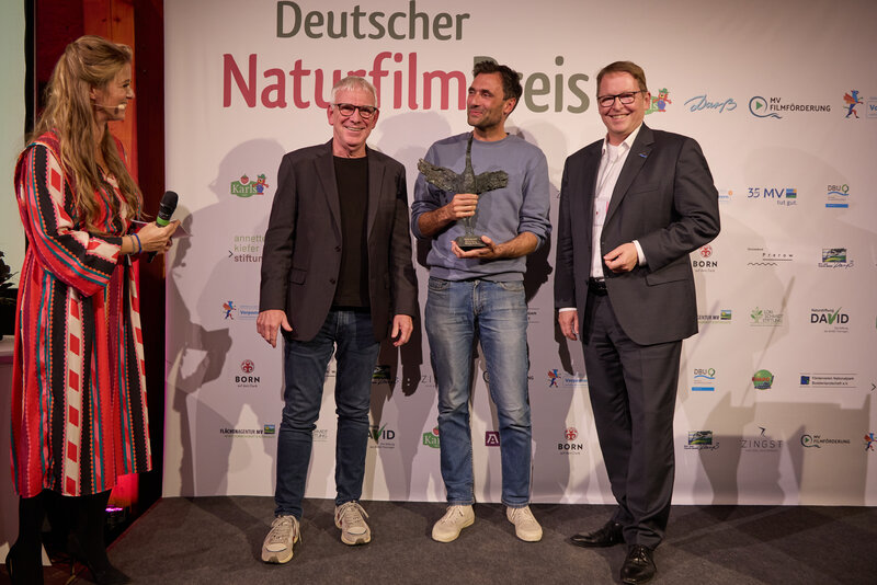Preisträger »Gefährlich nah – Wenn Bären töten« des Deutschen NaturfilmPreises 2025 in der Kategorie »Bester Film | Mensch und Natur« (v. l. n. r.: Jochen Flasbarth, Staatssekretär im BMUKN; Georg Tschurtschenthaler, Beetz Brothers film production; Jörg-Andreas Krüger, Preisjury)