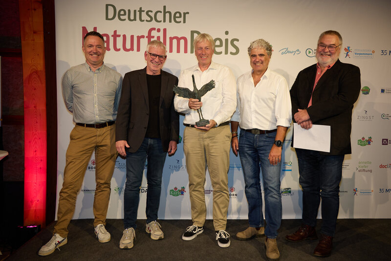 Preisträger »Orang-Utans – Die unbekannten Menschenaffen« des Deutschen NaturfilmPreises 2025 in der Kategorie »Bester Film | Wildnis Natur« (v. l. n. r.: Tom Synnatzschke, Doclights / NDR Naturfilm; Jochen Flasbarth, Staatssekretär im BMUKN; Thoralf Grospitz & Jens Westphalen, Zoorillafilm; Uwe Müller, Preisjury)